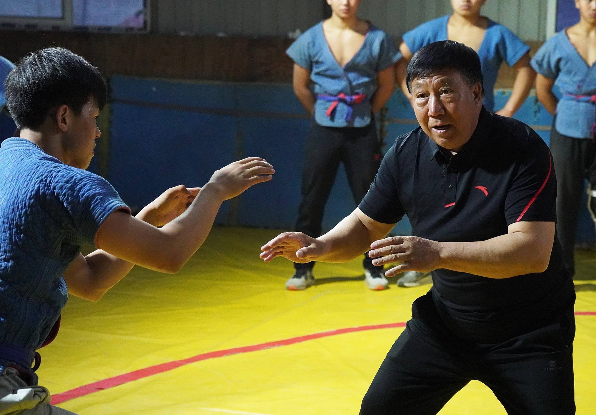 5月7日,摔跤馆内白鹤江指导孩子们训练。新华社记者 杨帆 摄“大概是在2010年,我的孩子们陆续成家了,肩头的担子轻一些了,就想着把摔跤捡起来,免费教村里孩子们摔跤。”白鹤江说。
