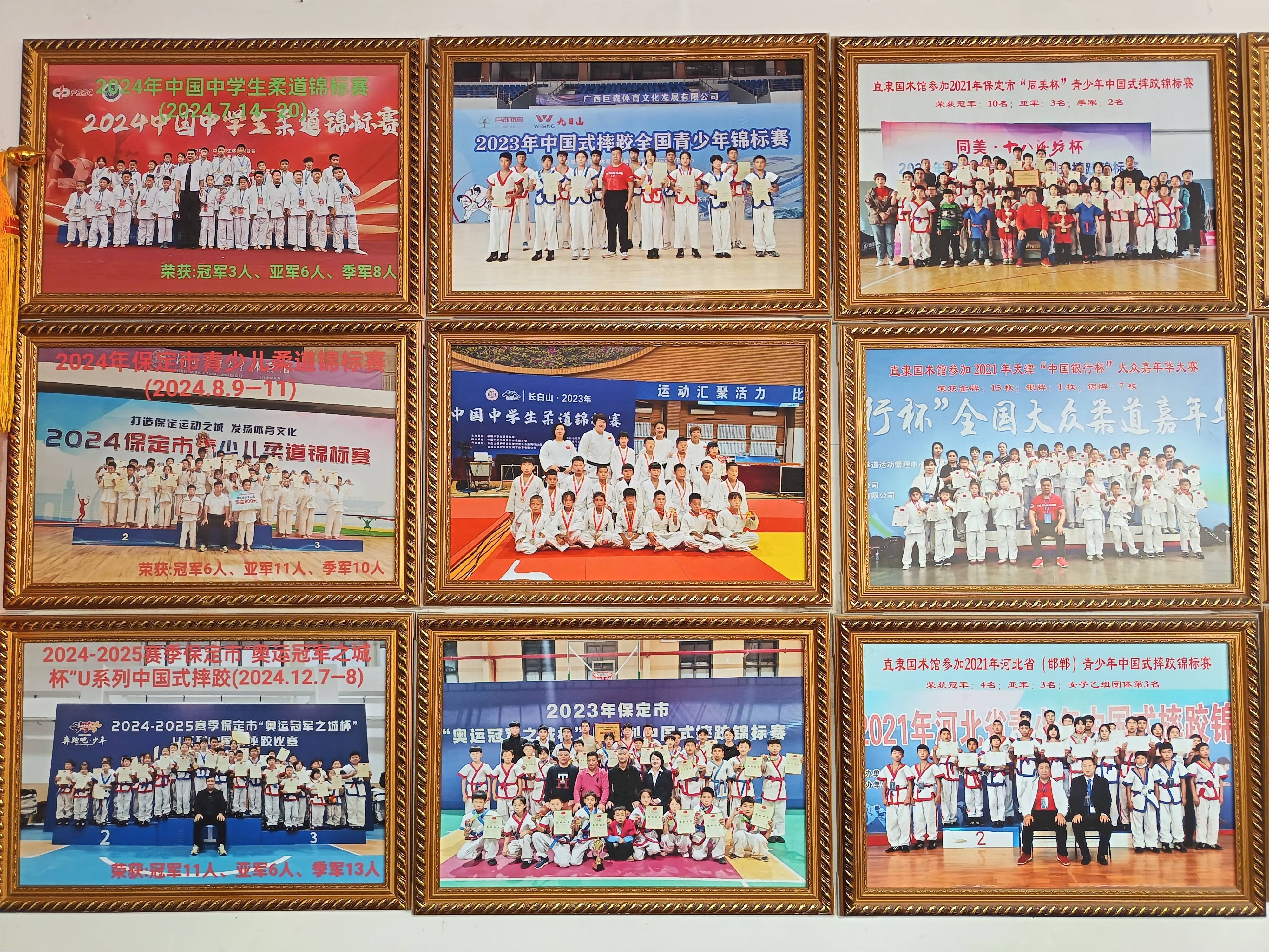 在摔跤馆北面有一排瓦房,房间里陈设简陋,但非常整洁。记者看到屋内三面墙上挂满了白鹤江带着孩子们去往各地参加比赛的合影,桌上放着多座奖杯。